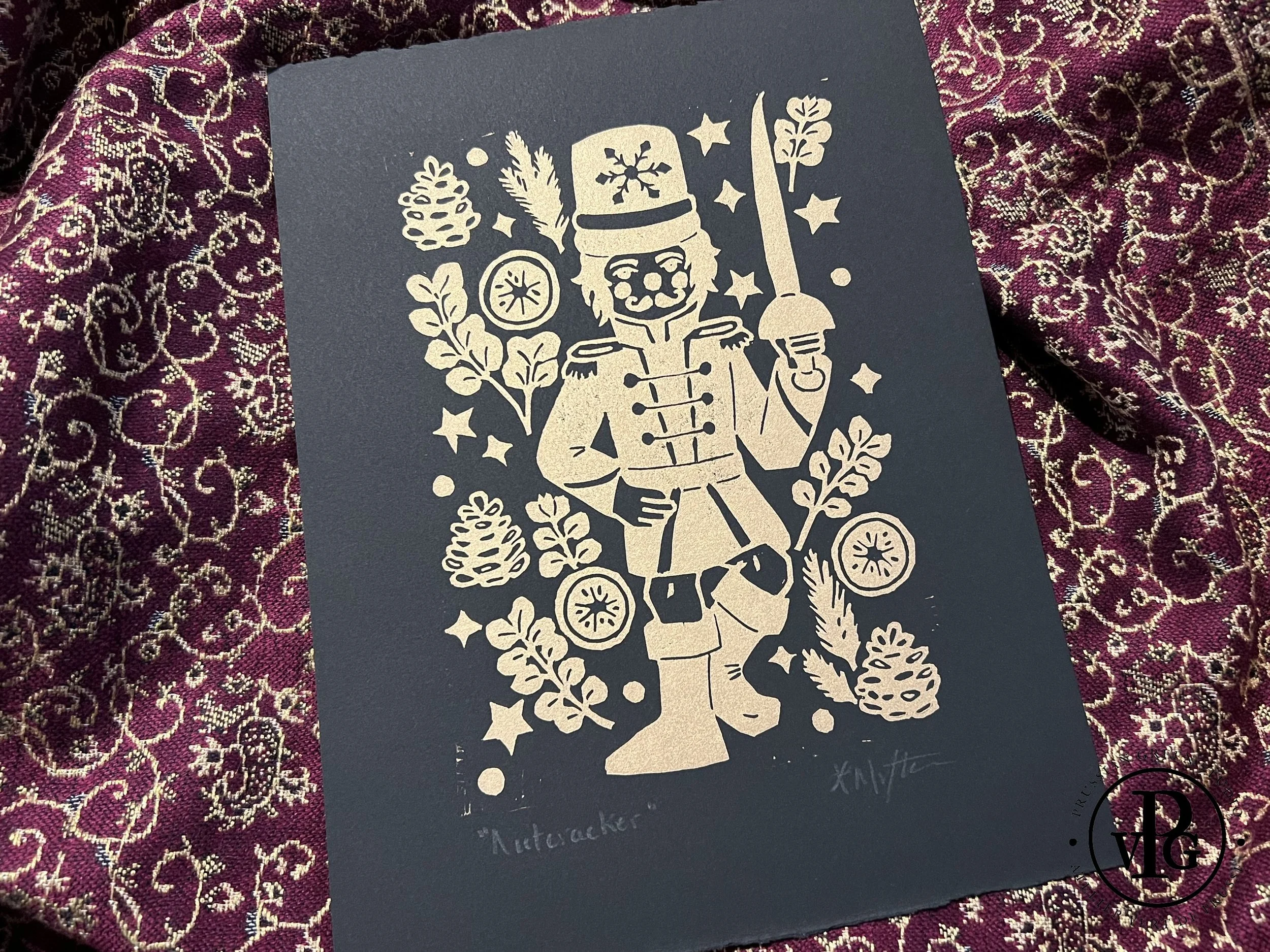 L’atelier a également créé une séries de linogravures inspirées de Casse-Noisette à l’encre dorée! Elles sont disponibles par ensemble de 3 (Casse-Noisette, Roi des souis, et la Fée) ou, si vous avez un coup de coeur pour une impression en particulier, elles peuvent être achetées séparément. Ces gravures feraient un beau cadeau pour ceux qui aiment la magie de l’hiver, la danse enchanteresse de la Fée, ou qui veulent se souvenir du ballet classique de Casse-Noisette.