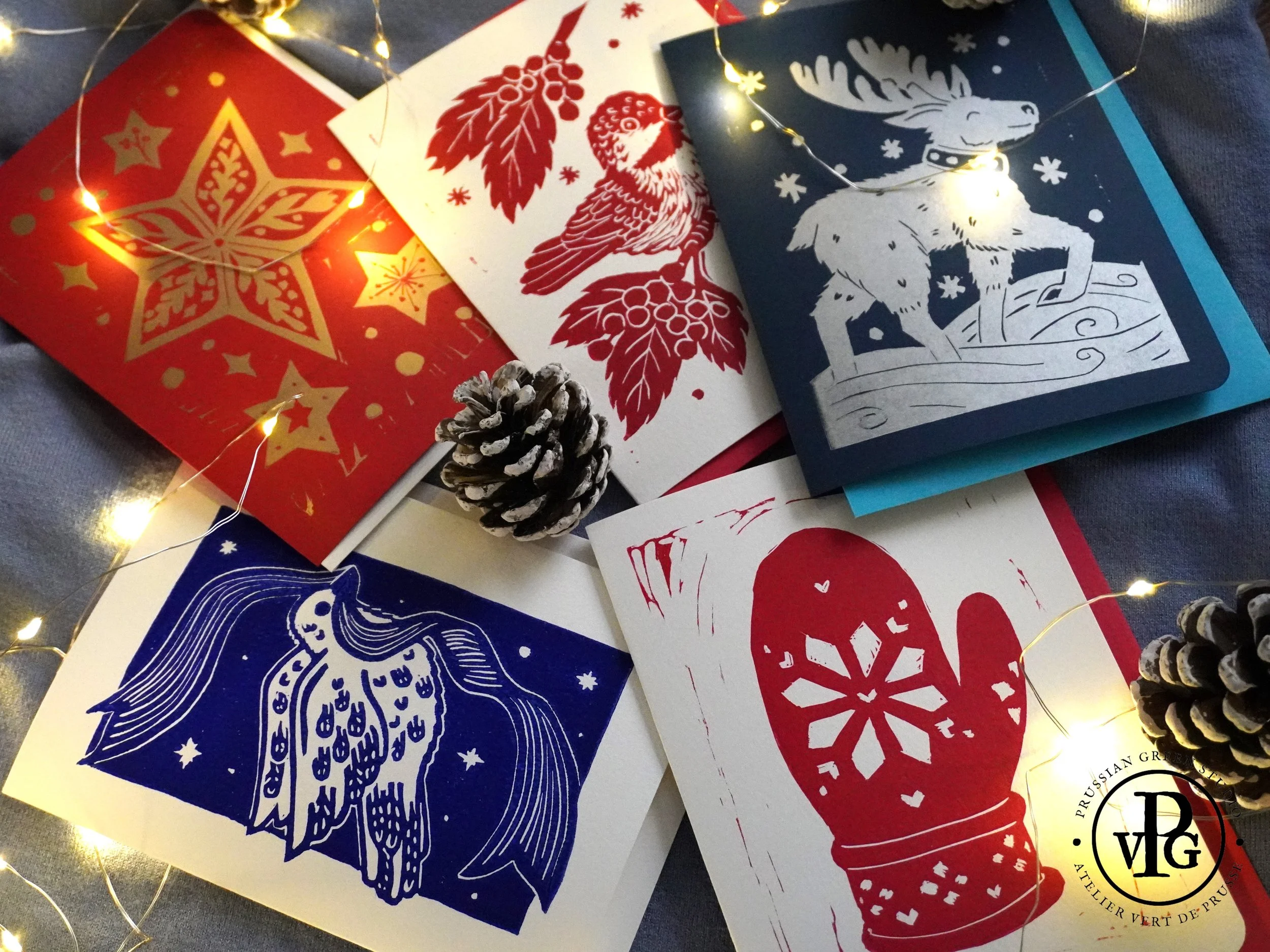This bundle features 5 winter and holiday themed handmade greeting cards with envelopes. Tis the season to send warm wishes with a handwritten message to loved ones near and far. These original linocut printed cards are a perfect way to give some holiday cheer to any home as they can also double as small works of art!