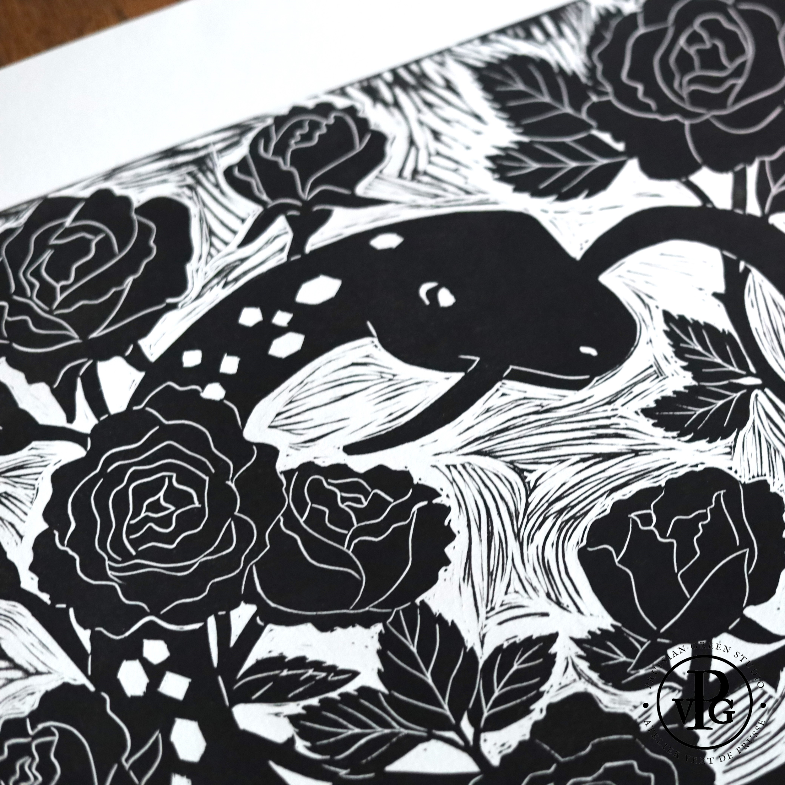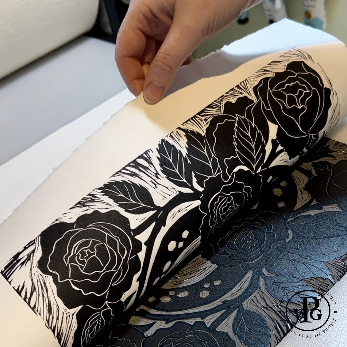 Toutes les œuvres de l’atelier sont produites artisanalement, parce que chaque plaque de lino utilisée pour imprimer l'un de mes dessins est gravée à la main. Les lignes ondulantes des pétales de rose ainsi que ses feuilles ont été amusantes à réaliser. Étant donné que la pression exercée par ma main est différente à chaque fois que je grave de la lino, il est difficile de reproduire exactement la même ligne.