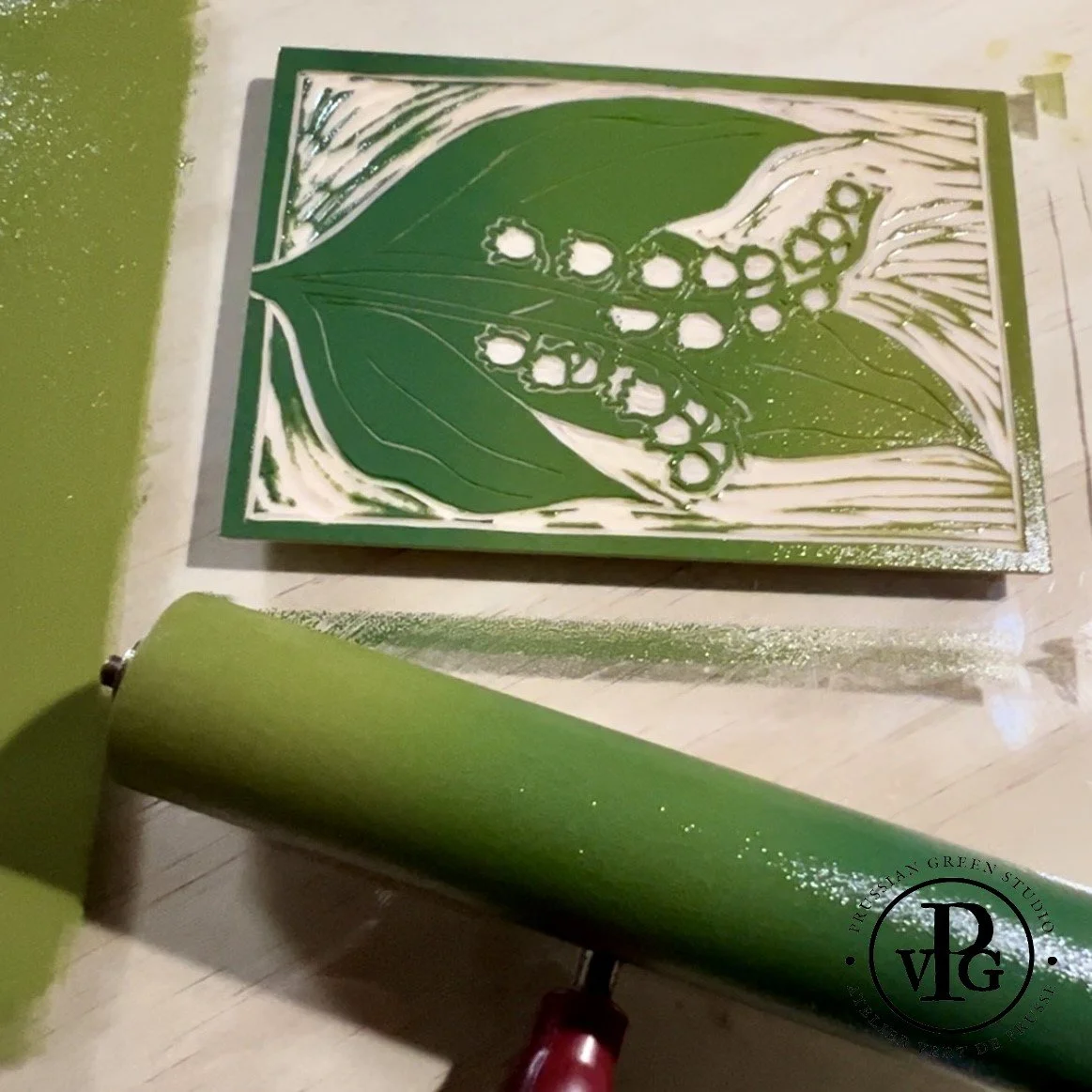 Combining various shades of green ink was a fun exercise in learning how to mix colours together, roll them out in a way that they don’t get muddy when they blend together. I made a few attempts at pairing different greens which were used to create limited edition prints of the lily of the valley flowers. They are available in the Studio’s Etsy shop, link in bio.
