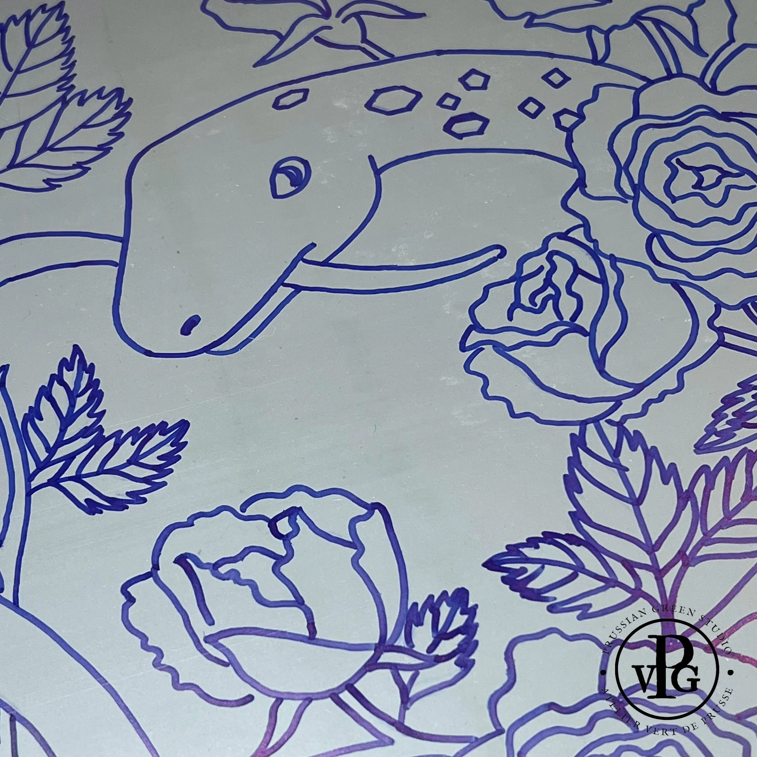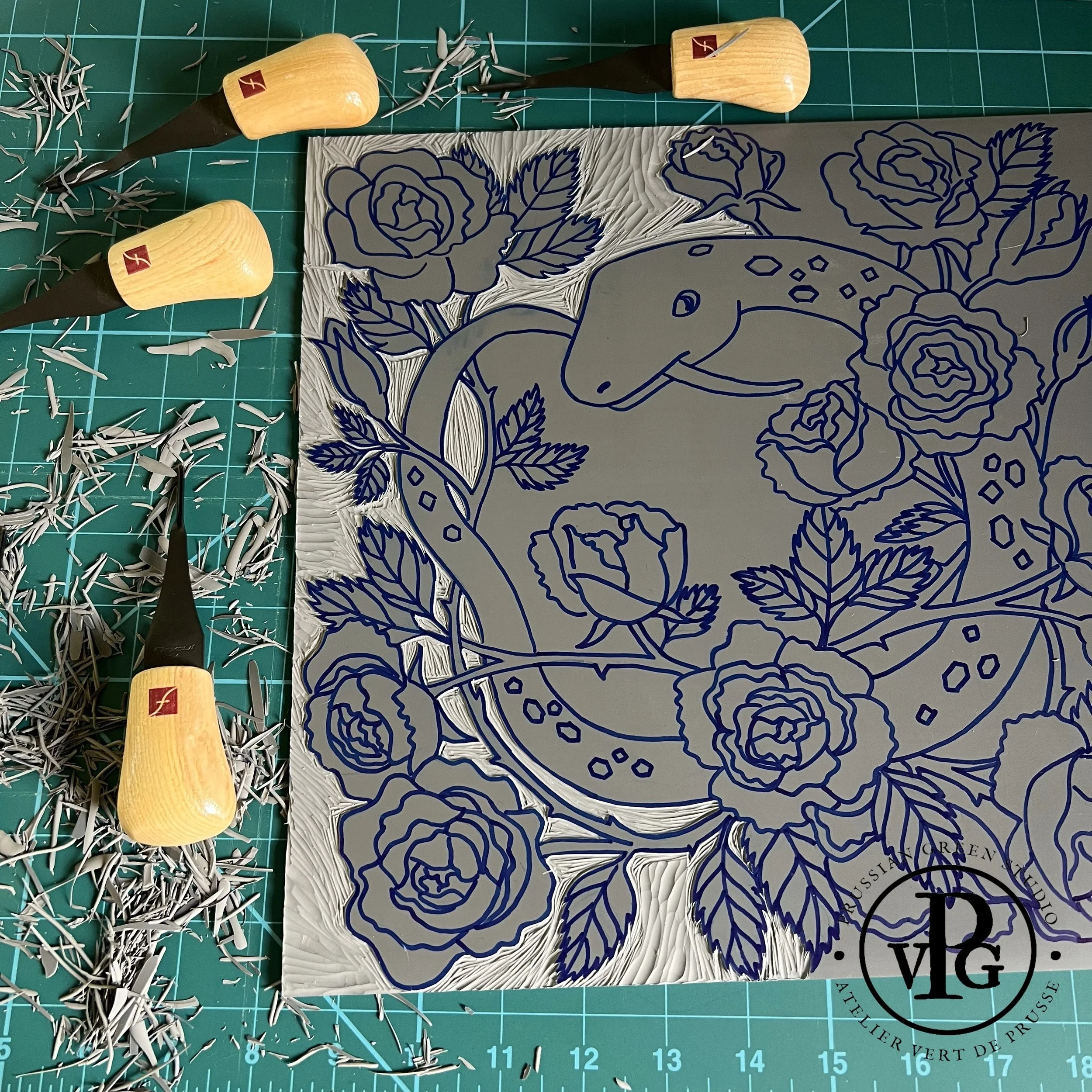 De l'esquisse à l'impression finale. J'ai commencé par m'inspirer du jardin, d'un serpent et les roses qui étaient en pleine floraison à ce moment-là, et j'ai cherché une idée qui pouvait intégrer les deux. Je me suis tournée vers les livres et j'ai trouvé le symbole de l'Ouroboros. À partir de là, j'ai dessiné, transféré et gravé le dessin sur une plaque de lino. Le plus grand que j'aie gravé jusqu’à présent. Après avoir fait quelques ajustements (l’encre, la pression, le papier sec et puis humide), l'œuvre finale a été imprimée ! Cette linogravure est disponible en deux versions, à l’encre noire ou bleu de Prusse.