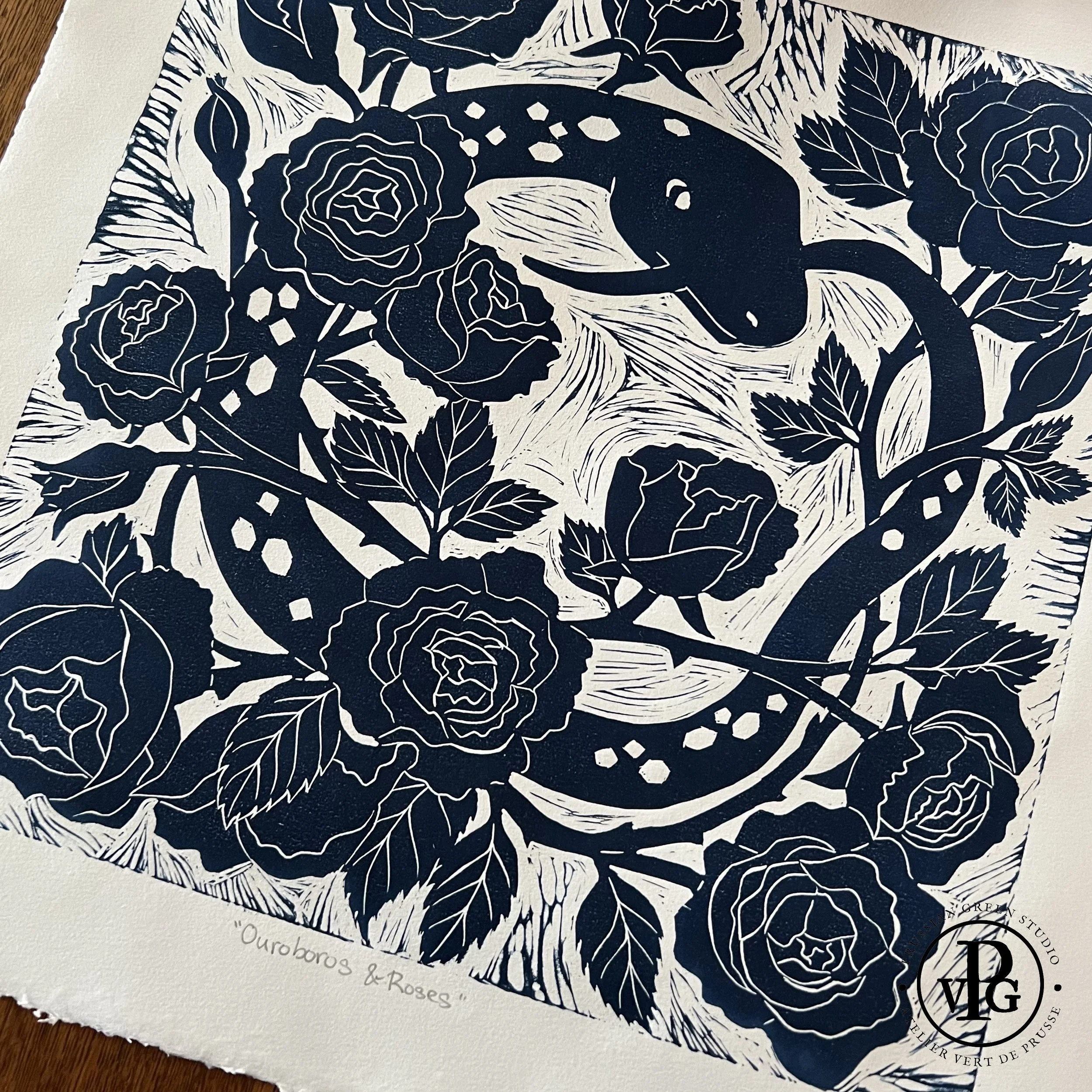 From sketch to finished print. I started off with a concept of taking inspiration from the garden, in this case a garden snake and the roses that were in full bloom at the time, and finding a design that could integrate both. I turned to books and found the Ouroboros symbol. From there, I drew, transferred and carved the drawing onto a lino block. The biggest one I had ever carved. After proofing and adjusting a few things (ink, pressure, dry and wet paper), the finished artwork was printed! It is available in two versions, black or Prussian blue ink.