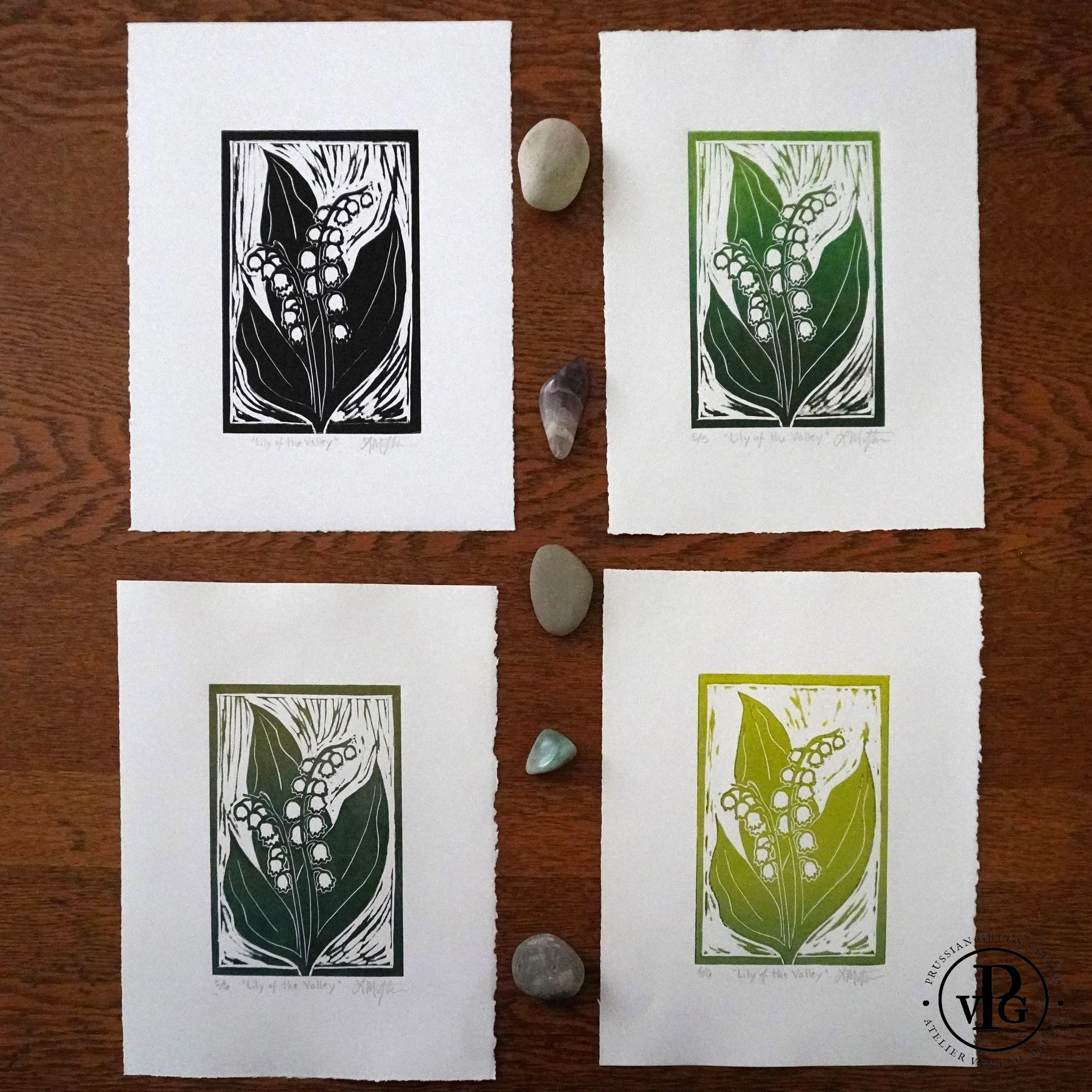 La combinaison de différentes nuances d'encre verte a été un exercice amusant qui m'a permis d'apprendre à mélanger les couleurs et à les étaler de manière à ce qu'elles ne s'embrouillent pas lorsqu'elles se fondent les unes dans les autres. J'ai fait quelques tentatives d'association de différents verts qui ont été utilisées pour créer des tirages en édition limitée de fleurs de muguet. Les linogravures sont disponibles dans la boutique Etsy de l’atelier, lien dans la bio.